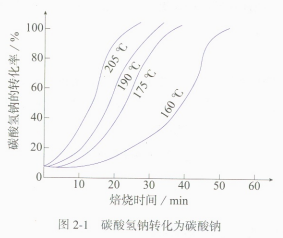 碳酸钠的熔点是851℃,当超过熔点时碳酸钠才稍稍分解。而碳酸氢钠超过100℃即开始分解,温度升高,分解加快。从图2-1可知,在170~180℃,约经过35min, 碳酸氢钠即全部分解为碳酸钠