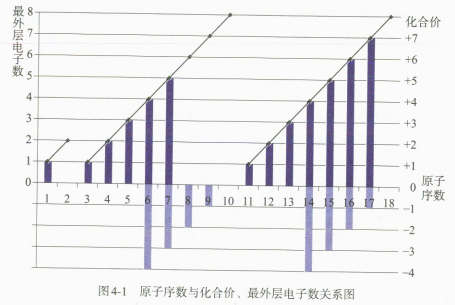 观察教材中的表4-5,以1~18号元素为例,以原子序数为横坐标,原子最外层电子数及化合价(最高正价、最低负价)为纵坐标,制作折线图和柱状图,并观察所得图形。(如图4-1所示)