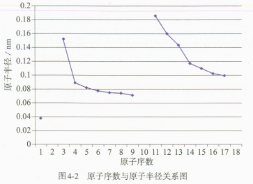 根据教材表4-5中原子半径数据,以原子序数为横坐标,原子半径为纵坐标,绘制折线图如图4-2所示。从点(同主族元素)、线(同周期元素)、面(不同周期的变化趋势)三个层次进行数据分析,归纳规律。