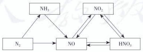在单元复习时可以将本节的主要物质N₂ 、NH₃ 、NO 、NO₂ 、HNO₃ 、Cu(NO₃)₂间的关系进行 整合,形成简洁直观的“氮三角”(如下图),并按箭头方向写出相关反应的化学方程式,使所学知识结构化。