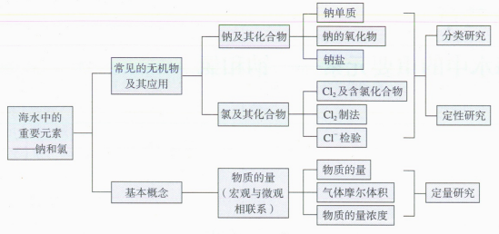 本章包含三部分内容:钠及其化合物、氯及其化合物、物质的量。这些内容分别属于课程标准中“内容标准”的“常见的无机物及其应用”“化学科学与实验探究”这两个主题,涉及金属、非金属、化学基本概念等,知识的跨度较大。在节的设计上,本章按元素类别编排,第一节是典型金属元素,第二节是典型非金属元素;每一节内部都按照物质分类、化学反应分类研究物质的性质和变化,突出了第一章中分类研究的思想。本章具体内容结构如下页图所示。