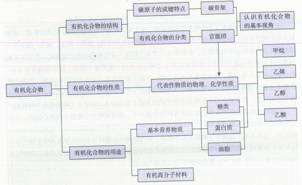 在介绍具体有机物的组成、结构、性质和变化等事实性知识的同时,教材注意落实学科核心素养,将宏观性质与微观结构结合起来,先后编入有机物中碳原子的成键特点、烃的分类、官能团与有机物分类等内容,并通过“方法导引”“整理与提升”等栏目建立认知模型,给出碳骨架和官能团这两个辨识有机物的重要视角,以及在此基础上认识有机物的一般思路。同时,本章结合代表性有机物的性质和基本有机反应类型,给出一些简单有机物间的转化关系,在无机化学的基础上进一步深化化学中的变化观念。教材较多地体现有机物的结构和分类在学习中的指导作用,在教学中要充分考虑学生的实际情况,避免随意扩充内容和提高难度;应立足基本知识,渗透观念和方法,提升学生的认知水平,落实素养要求。本章的内容结构框架如下图所示。