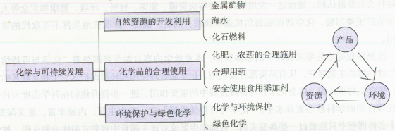 自然资源为人类提供了生存和发展的物质、能源基础。从化学角度看,开发利用自然资源的过程就是利用化学变化获得有用物质、获取能量的过程。教材以金属矿物、海水、化石燃料的开发利用为例,让学生了解化学在资源开发利用中的地位和作用,以及伴随这一过程产生的环境问题;以化肥、农药的合理施用,合理用药和安全使用食品添加剂为例,让学生认识化学品在农业生产、人体营养与健康中的重要作用,体会生态系统中人与自然“你中有我、我中有你”的紧密联系。资源开发利用与保护资源、保护环境,这是自然界中人类始终面临的、需要协调的问题。坚持可持续发展,树立“绿色化学”的观念为当前化学的应用与发展指明了方向。
