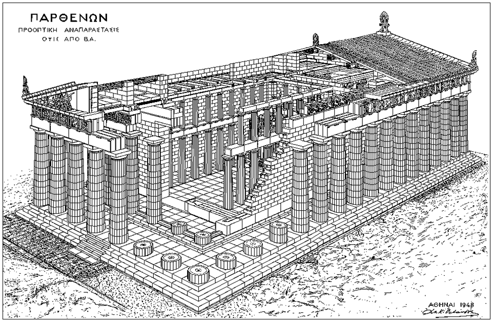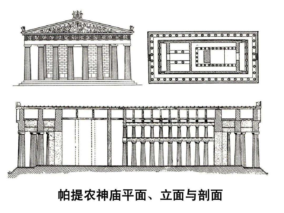 帕提农神庙代表着古希腊多立克建筑的最高成就,建筑内部存在一个重复使用的比例4:9