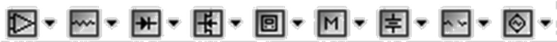 实际元件库分15个元件分类库,每个元件库放置同一类型的元件,从左到右分别是:信号源库(Sources)、基本元件库(Basic)、二极管库(Diode)、三极管库(Transistor)、模拟元件库(Analog)、TTL元件库(TTL)、CMOS元件库(CMOS)、各种数字元件库(MiscDigital)、数模混合元件库(Mixed)、指示元件库(Indicator)、电源库(PowerComponent)、混合元件库(MiscellaneousComponents)、键盘显示元件库(AdvancedPeripherals)、射频元件库(RF)、机电类元件库(Electromechanical)。