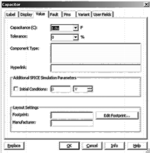 可以将鼠标指针移至相关元件并双击鼠标左键调出相关对话框(如图2-4所示),或者首先单击鼠标左键选中该元件,然后单击鼠标右键或者单击菜单栏“Edit”再单击“Properties”也可以直接使用快捷键“Ctrl+M”调出相关对话框,在“Value”栏下通过直接输入数据实现元件参数的设置及修改。