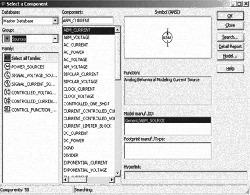 首先通过2.1.2中列出的四种元器件放置方法中的任意一种,打开“Sources”元器件库对话框(如图2-5所示),“Family”栏选择“POWER_SOURCES”;则可在“Component”栏选择相应电源(选择“GROUND”为接地符号);最后,单击右侧“OK”按钮,然后移动鼠标指针将相应电源(或接地符号)移至电路工作区合适位置,单击左键完成放置。
