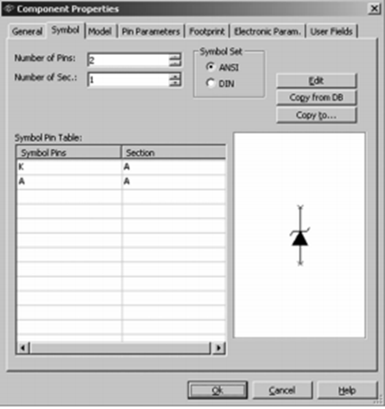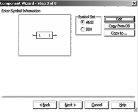 完成输入元器件和封装信息后,就要为元器件设计符号(如图2-14所示)。其中,“ASIN”(美国标准)和“DIN”(欧洲标准),一般选择“DIN”;用户可以通过点击“Edit”按钮,在打开的符号编辑器(如图2-15所示)中进行编辑,或者点击“Copefrom DB”按钮选择从元器件库中拷贝现有符号,完成符号设计。然后,设置管脚参数(如图2-16所示)。