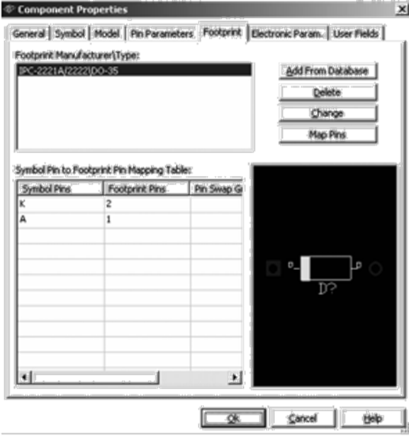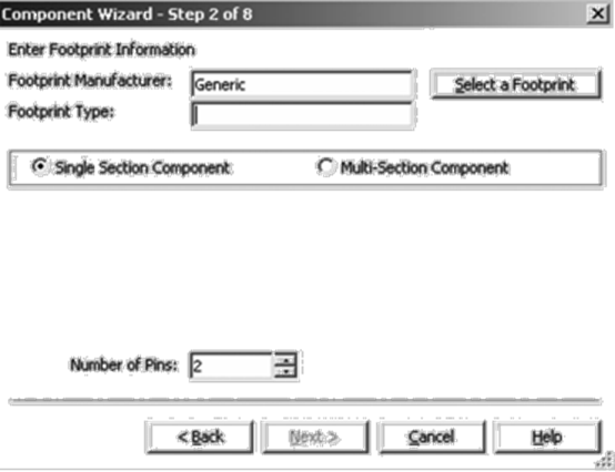 如图2-13所示,可以点击“Selecta Footprint”按钮从制造商数据表所列出的封装中为该元器件选择一种封装;如果知道封装的名称,您也可以在“FootprintManufacturer Type”(封装类型)栏内直接输入该名称。然后,选择器件属于单部件还是多部件,并在“Numberof Pins”栏定义元器件的管脚数目。