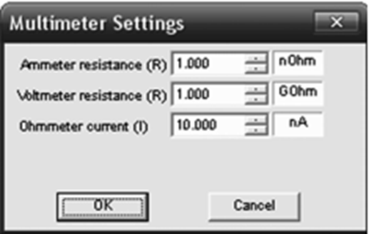 按面板图中的Set(设置)按钮时,会弹出下图所示的一个对话框,可进行万用表的内部参数设置。可设置数字万用表的内部参数:电流表内阻、电压表内阻、欧姆表内阻。
