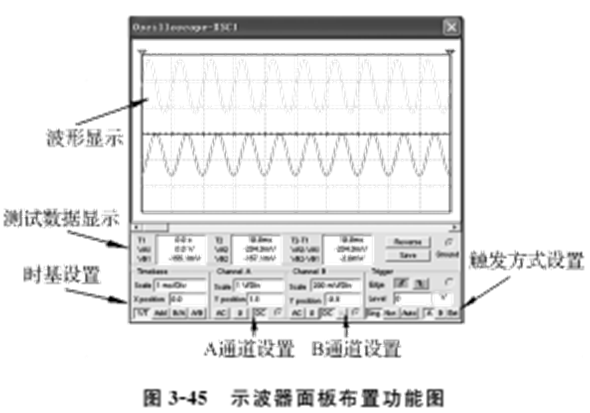 示波器的面板布置按功能不同分为6个区:时基设置区、触发方式设置区、A通道设置区、B通道设置区、测试数据显示区及波形显示区。