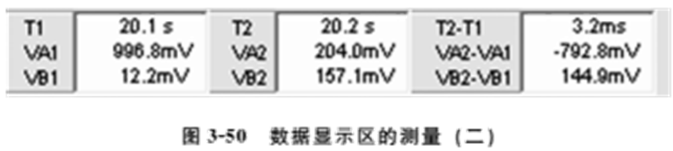 (3)右侧数据区:T2-T1表示2号读数游标所在位置与1号读数游标所在位置的时间差值,可用来测量信号的周期、脉冲信号的宽度、上升时间及下降时间等参数。VA2-VAl表示A通道信号两次测量值之差,VB2-VBl表示B通道信号两次测量值之差。
