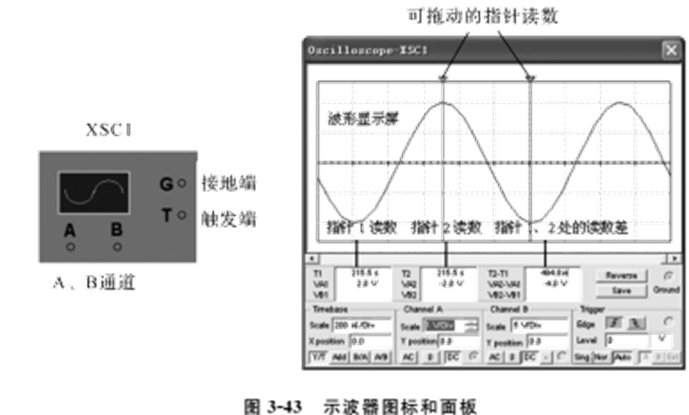 示波器(Oscilloscope)是电子测量中使用最为频繁的重要仪器之一,可用来观测信号的波形并可测量信号的幅度、频率、周期和相位差等参数。Multisim10提供了数字式存储示波器,借助它用户可以看到通常在实验室无法看到的瞬间变化的波形,并加以存储保留。示波器的图标和面板如图3-43所示。
