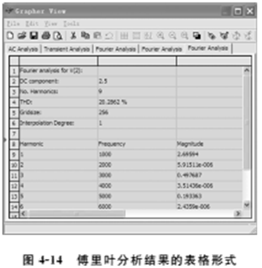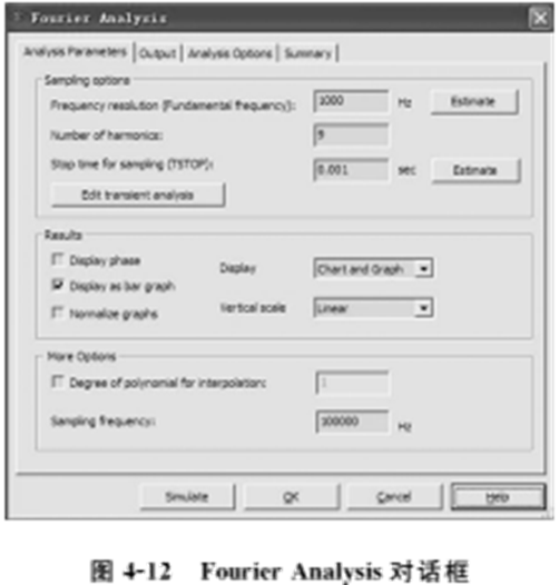 Frequencyresolution(Fundamentalfrequency):设置基频。进行傅里叶分析前,先确定分析节点,其次把电路的交流信号激励源频率设置为基频。如果电路中有多个交流信号源,则取各信号源频率的最小公因数频率。例如有55kHz和95kHz两个交流信号源,则取05kHz作为基频。如果不知道如何设置,可以单击Estimate按钮,由软件自动设置。