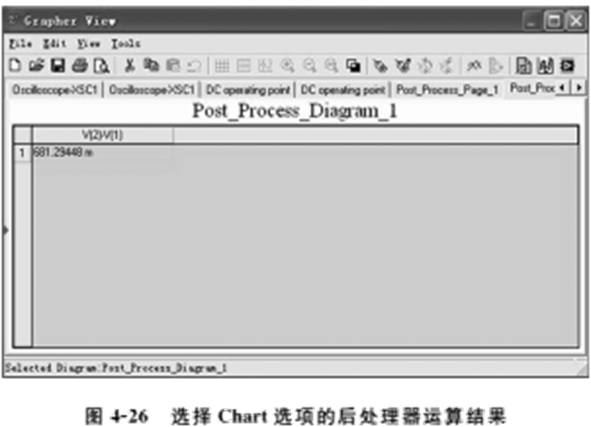 (5)单击Calculate按钮,将会弹出GrapherView对话框,显示后处理器运算结果。若在Diagrams列表栏的Type下拉菜单中,选择Graph选项,后处理器运算结果在GrapherView对话框中如图4-25所示。若在Type下拉菜单中,选择Chart选项,后处理器运算结果在GrapherView对话框中如图4-26所示。