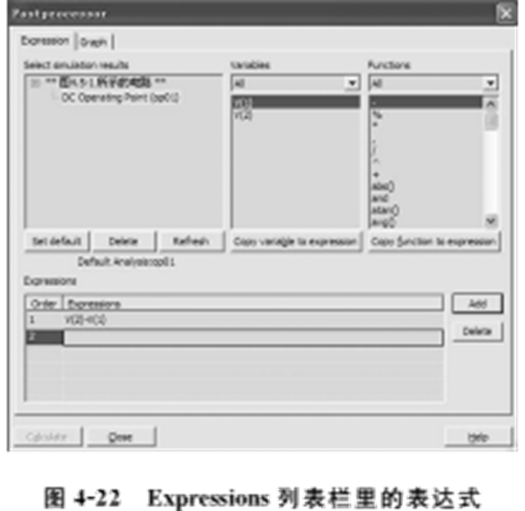 (5)重复进行选择所用的仿真分析、变量和函数,直至完成表达式。然后单击Add按钮,将Expressions列表栏中的表达式保存并添加新的一栏,如图4-22所示。