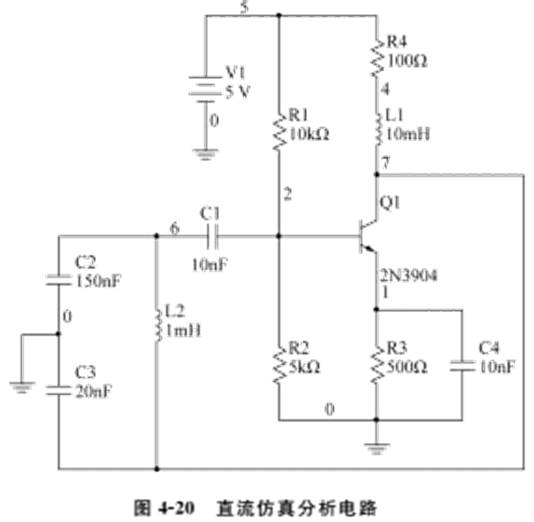 在使用后处理器时,必须先执行至少一次仿真分析。对电路进行后处理主要分两个步骤:一是利用电路仿真结果中的变量,建立数学表达式。二是设置显示控制参数,观察表达式运算结果。下面以图4-20所示的电路为例,说明后处理器的具体操作步骤。
