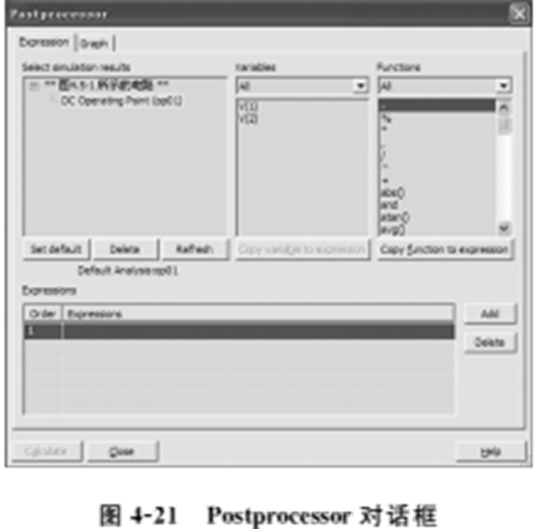 (1)单击Multisim10用户界面中Simulate菜单中Postprocessor命令,弹出后处理设置Postprocessor对话框,如图4-21所示。