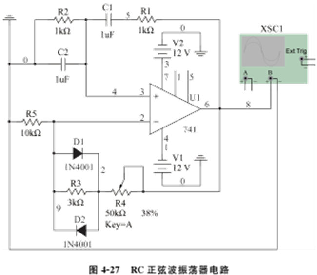 元件列表清单(Billof Materials)提供了当前电路图中元件的列表和摘要信息,主要是元件的数量、种类、参考序列号和封装等内容。元件列表清单主要用于当前电路图所用元件的采购或制造,因此只列出了“真实”元件,也就是说那些“非真实”的元件或无法购买的元件则没有列出,如各种电源、信号源和虚拟元件就没有罗列。下面以图4-27所示的RC正弦波振荡器电路为例,具体说明元件列表清单的操作步骤。