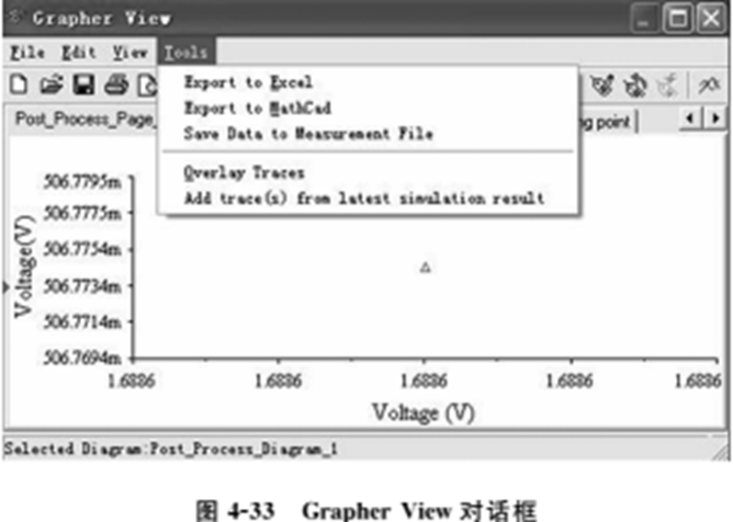 (1)单击Multisim10用户界面中View菜单下的Grapher命令,将会弹出GrapherView对话框,如图4-33所示,通过该对话框可以查看分析结果。