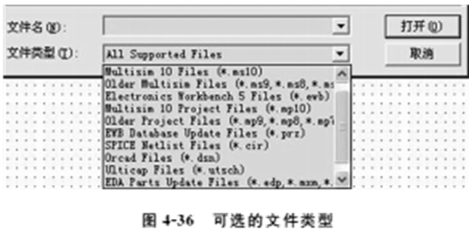 Multisim10可以输入其他应用软件的电路图文件。单击Multisim10用户界面中File菜单下的Open命令,弹出打开文件对话框。可打开的文件类型主要有EWB(*.ewb)、Multisim(*.msm)、OrCAD电路图(*.dsn)、Ulticap电路图(*.utsch)以及SPICE网表文件(*.cir)、PSPICE网表文件(*.cir)等,如图4-36所示。