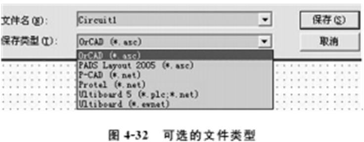 (2)在SaveAs对话框中输入文件名和存放路径,在文件存放类型的下拉菜单中选择相应软件制造商的名称,如图4-32所示。然后单击Save按钮,Multisim10将会自动创建一个能被该制造商PCB板设计软件调用的文件。