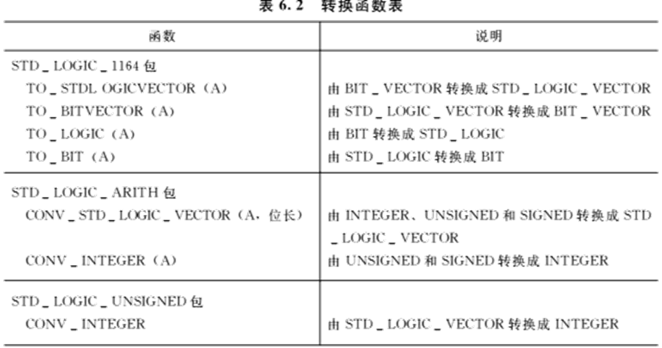 利用类型转换函数来进行类型转换需定义一个函数,使其参数类型为被转换的类型,返回值为转换后的类型。在实际运用中经常使用类型转换函数,VHDL的标准程序包中提供了一些常用的转换函数,见表6-2。