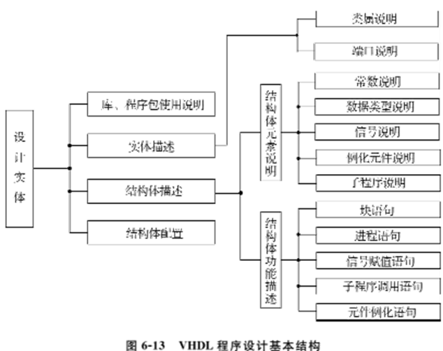 VHDL语言主要由实体、结构体、库、程序包及配置构成,如图6-13所示。