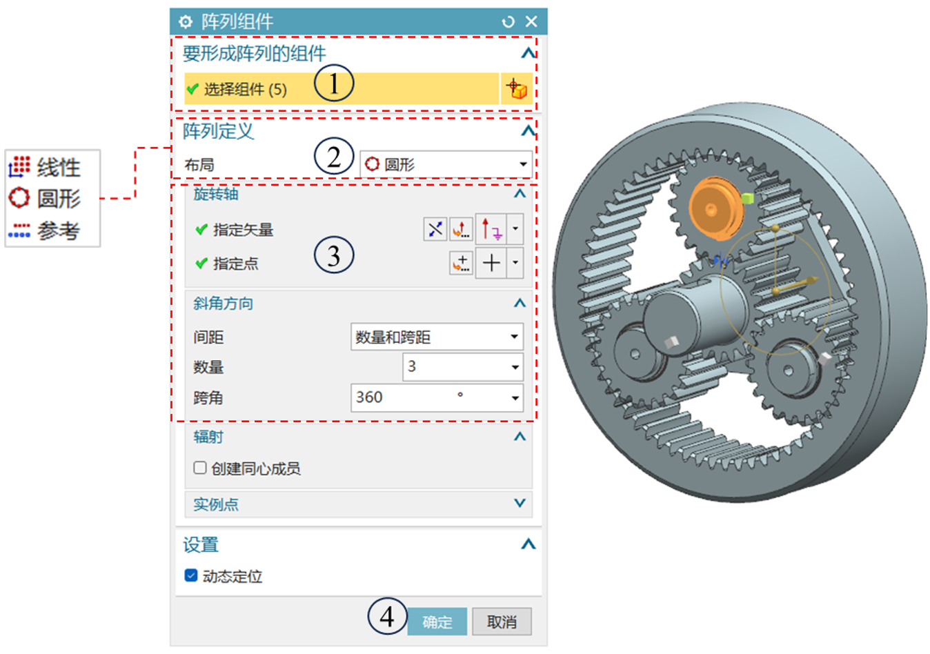 类似于建模使用的阵列特征工具,其一般使用步骤为:选择要阵列的组件(可以是单个或者多个)→指定阵列布局类型(可选圆形、线性、参考)→确定阵列布局对应的条件,并输入相关参数→预览并确定阵列特征。