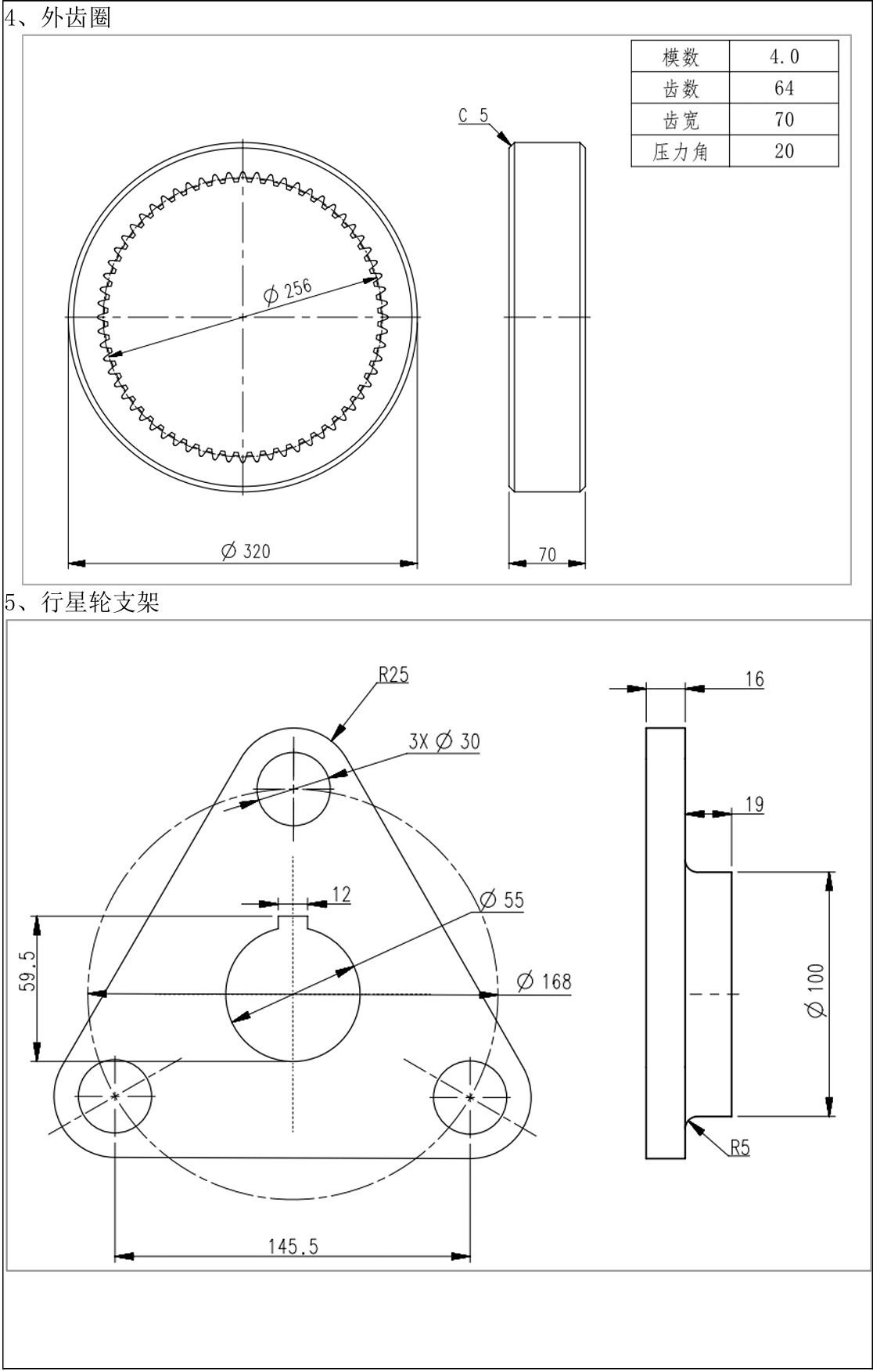 通过本项目的行星齿轮设计,相信大家已经熟悉行星齿轮的功能与结构,在工业应用中行星齿轮会根据实际需求改变结构设计,本次拓展任务是一款改进型行星齿轮,请结合本次任务的经验,参照下面提供的行星齿轮相关资料,制定工作计划,完成行星齿轮各零部件三维建模、组件装配和渲染,并提交设计资料(包括三维模型、装配体、渲染效果图、设计说明等)。