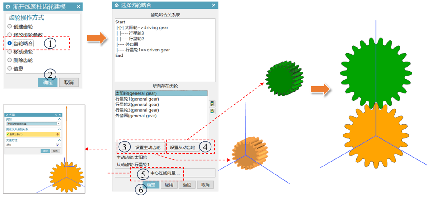 进行齿轮啮合,其一般使用步骤为:选择齿轮操作方式(点选齿轮啮合)→确定→指定齿轮啮合关系(分别设置主动齿轮driving gear,从动齿轮driven gear,)→指定齿轮中线连线向量(可以通过矢量构造器指定)→确定,查看啮合结果。