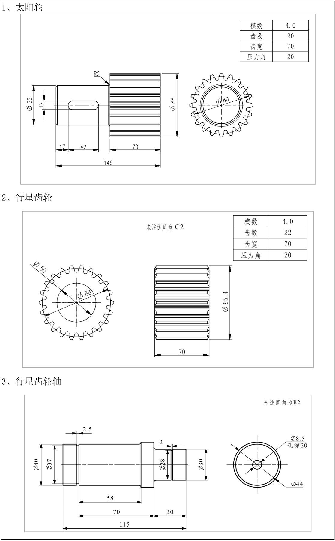 1、能描述行星齿轮各零部件的结构特点及特征。