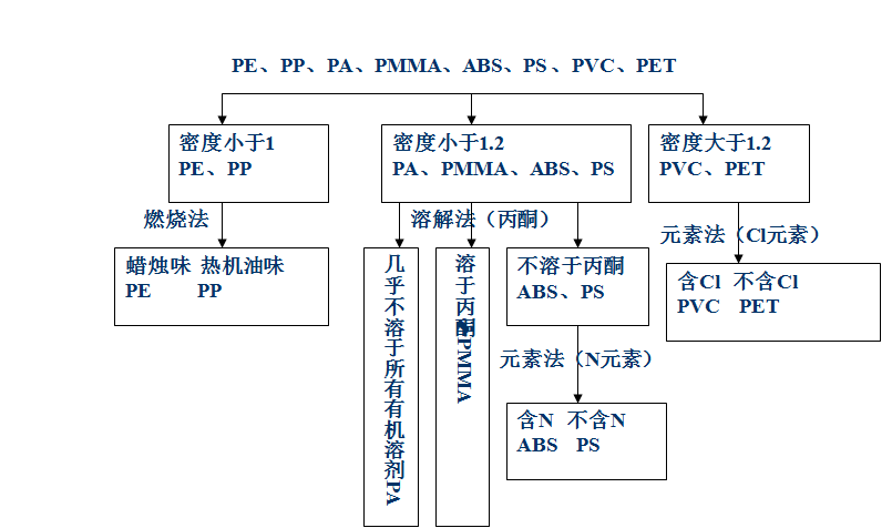 有一组塑料试样:聚乙烯(PE)、聚丙烯(PP)、聚酰胺(PA)、聚苯乙烯(PS)、有机玻璃(PMMA)、ABS、聚氯乙烯(PVC)和聚酯(PET),综合运用所学的知识进行鉴别。