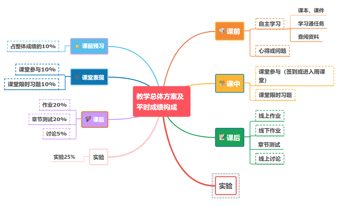 本课程总体成绩构成由学习过程成绩+试验成绩+期末测试成绩三部分构成功能,其中学习过程成绩(平时成绩)占总评成绩的40%,试验成绩占课程成绩的10%,期末考试成绩占总评成绩的50%,学习过程成绩构成如下图所示,请各位同学提前明确,认真准备,取得好的成绩。