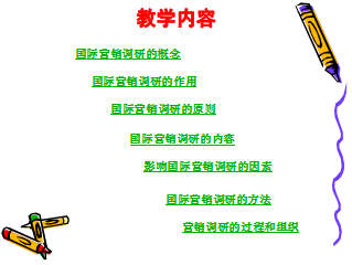 | 教学目标 | 了解国际市场调研的内容; 掌握国际市场调研的方法; 了解国际市场调查组织; | ||
