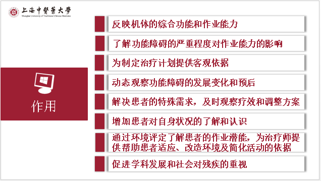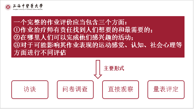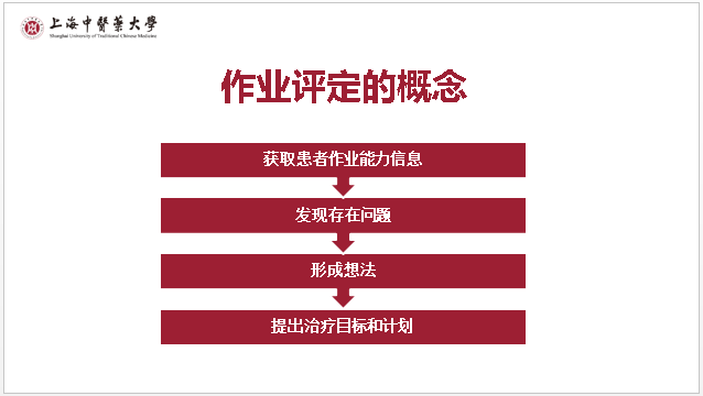 作业评定是一个系统地收集那些影响人们作业表现的信息的过程,通过作业评定,获取患者作业能力信息,并发现问题、形成想法、提出治疗目标和计划的过程。评定可借助于回顾病历、正规评定量表及一些专项检查,也可通过与患者接触,通过交谈、观察获取评定信息。