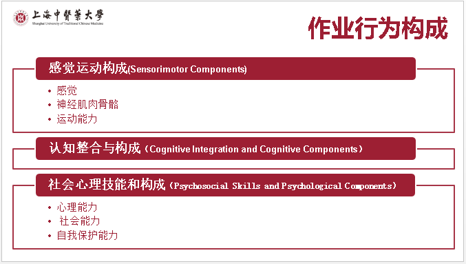 任务分析主要评估患者就诊时、治疗前和治疗后的活动与行为构成、行为场景之间的关系。可以从两个方面进行评定:活动中行为构成的作用;活动中行为场景的作用