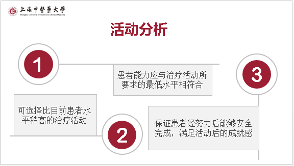 在治疗过程中评估治疗性活动中患者的主动性和行为构成,是对一项治疗性活动的基本行为构成以及患者能够完成该活动所应具备的功能水平的一个分析认识的过程。