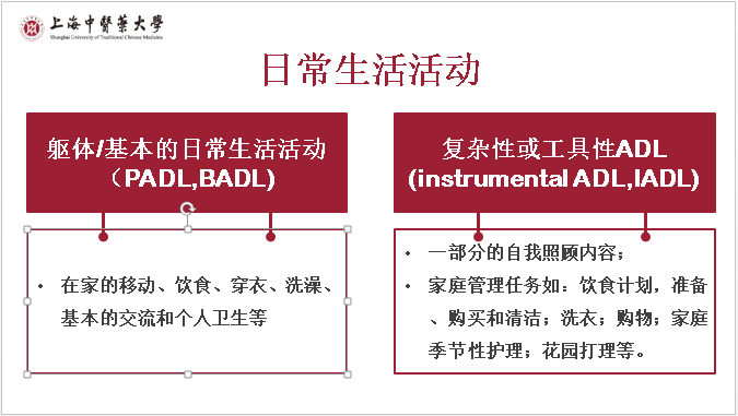 日常生活活动能力(activitiesof daily living, ADL)是指人们为了维持生存及适应生存环境而每天必须反复进行的、最基本的、具有共同性的身体活动,即进行衣食住行及个人卫生等的基本动作和技巧。日常生活活动能力是个体在发育过程中逐步习得,可通过反复实践来完善,对于一般人,这种能力是极为普通的,但对于残疾者却往往是难以进行的高超技能。