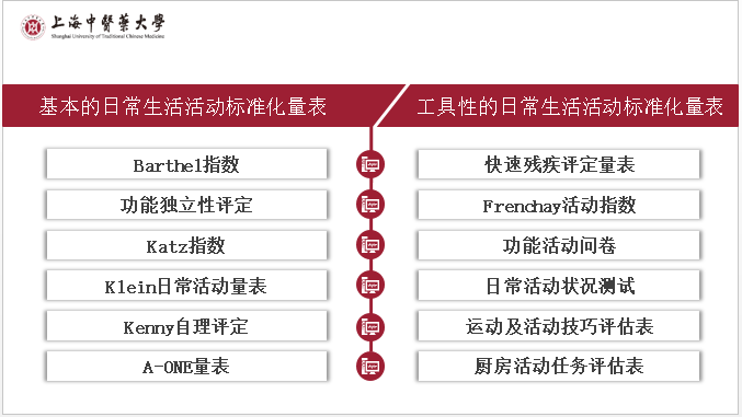 (1)Barthel指数:该量表是由FlorenceMahoney和DorothyBarthel于1965年设计并应用于临床,包含大便控制、小便控制、修饰、如厕、进食、上楼梯、洗澡、转移、步行、穿着10项内容。根据需要帮助的程度分为0、5、10、15分四个等级。总分为100分,得分越高,独立性越强,依赖性越小。若总分达到100分,表示患者不需要照顾,日常生活可以自理,但并不意味着患者能独立生活,他可能不能烹饪、料理家务和与他人接触。评出分数后,可以按下列标准判断患者ADL独立程度:60分以上者为虽然有轻度残疾,但生活基本自理;40~60分者为中度残疾,生活需要帮助;20~40分者为重度残疾,生活需要很大帮助;20分以下者为完全残疾,生活完全依赖。1995年,国外学者Korner-Bitensk和Wood-Dauphinee提出改良的BI量表,称为MBI(modified Barthel index),将量表评分更加细化,并被认为可以预测患者将来的恢复。