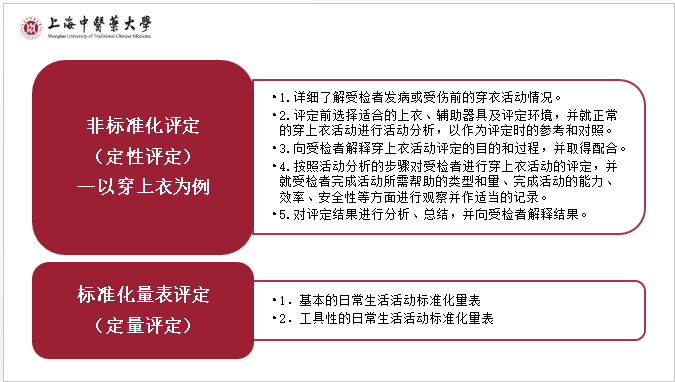 (4)日常活动状况测试:该量表是Skurla和Rogers于1988年提出的,主要是用于痴呆患者作业表现的测评,这些测评主要内容有4项:穿衣、饮食准备、购物、电话,每项内容又分为子项目:穿衣10项;饮食准备9项;购物8项;电话11项。评分采用0~4分5级评分,分数越低代表能力越差,穿衣最高得分40分,饮食准备36分,购物32分,电话44分。完成该测试需要的时间随着个人作业表现能力不同而有长有短。可靠性、有效性未见数据报道。优点是为痴呆患者提供了作业表现内容的测评。