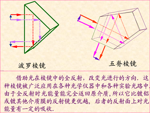 Ø全反射在理论上优于一切镜面反射,在实际的光学仪器中,常利用全反射棱镜代替平面反射镜,以较少光能的反射损失