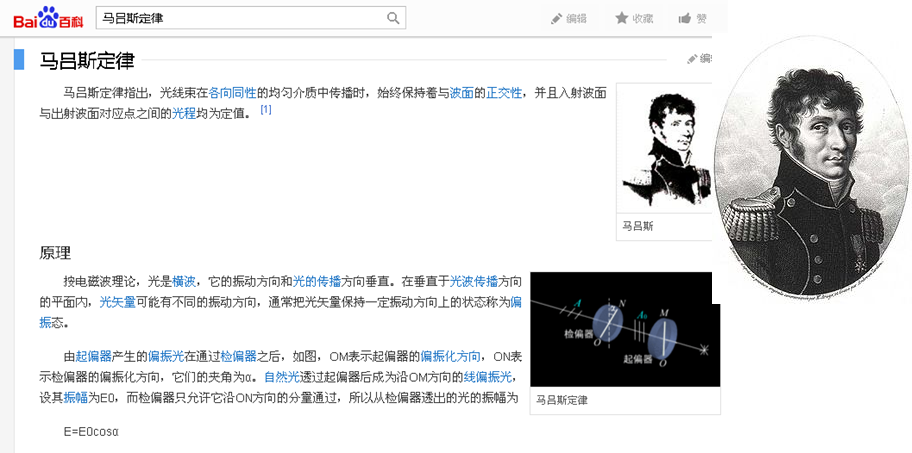 •马吕斯定律指出,光线束在各向同性的均匀介质中传播时,始终保持着与波面的正交性,并且入射波面与出射波面对应点之间的光程均为定值。(1808年)