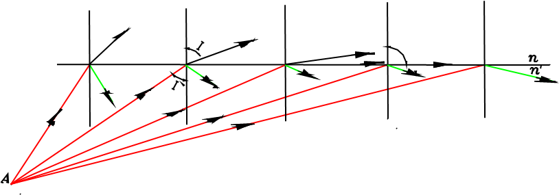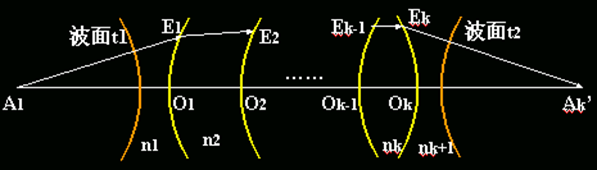 费马原理 在任意两个波面之间的所有光线,光程也相同,(波面是相同时间到达点的曲面)