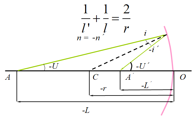 在折射面的公式中,只要使n¢ =-n,便可直接得到反射球面的相应公式。
