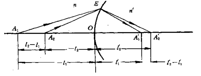 如果物点沿轴移动有限距离,如图所示,此距离显然可以用物点移动的始末两点A1和A2的截距差l2-l1 来表示,相应于像点移动的距离应为l 2¢-l 1¢
