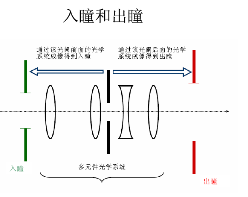 因光阑前无透镜,直接比较光阑及透镜对物的张角,可知光阑即入射光瞳。出射光瞳是这光阑被其后面透镜所成的象。
