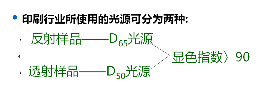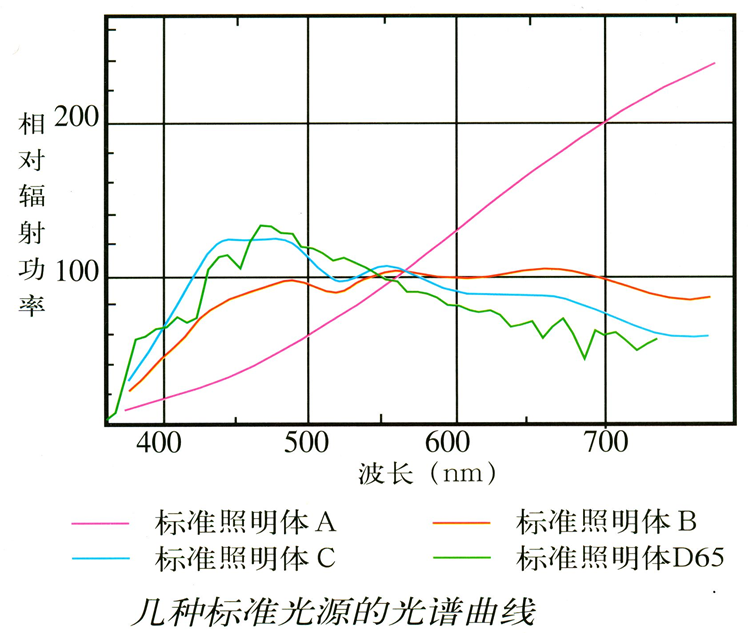•标准照明体D:代表各种时相的日光的相对光谱功率分布,又名典型日光或重组日光。