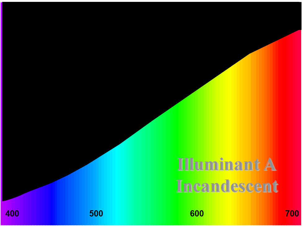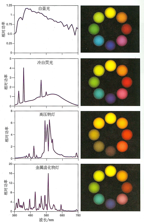 •白炽灯的光谱分布与火光类似,显色性很好。具有与白炽灯和日光相似的连续光谱的光源均有较好的显色性。