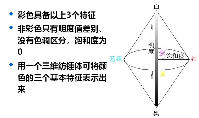•色调:区分不同彩色的特征•饱和度:颜色接近光谱色的程度,彩色的纯洁性